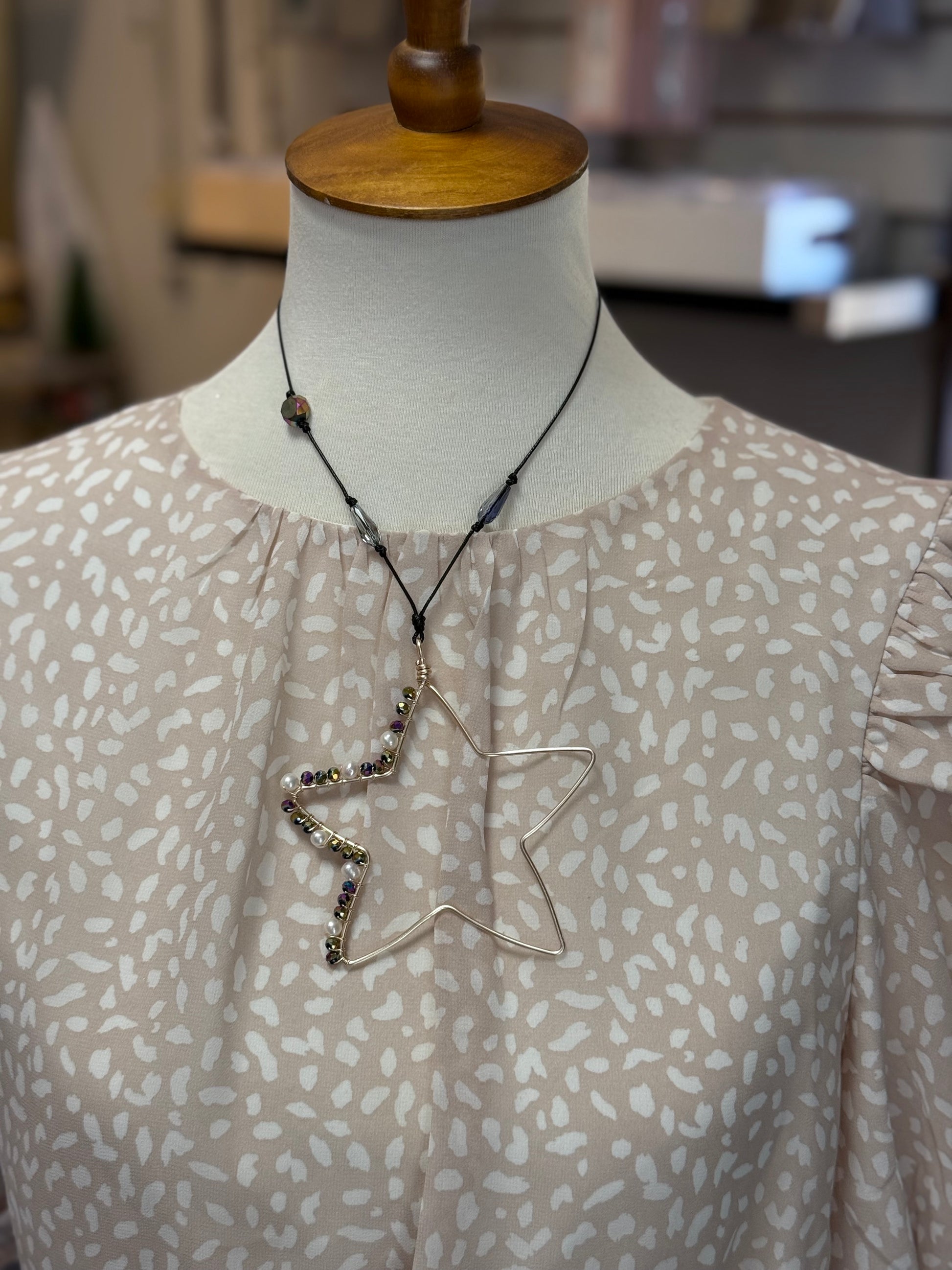Collar Ajustable + estrella alambrada, trabajada a mano + cristal. Úsalo largo o corto + pantalla