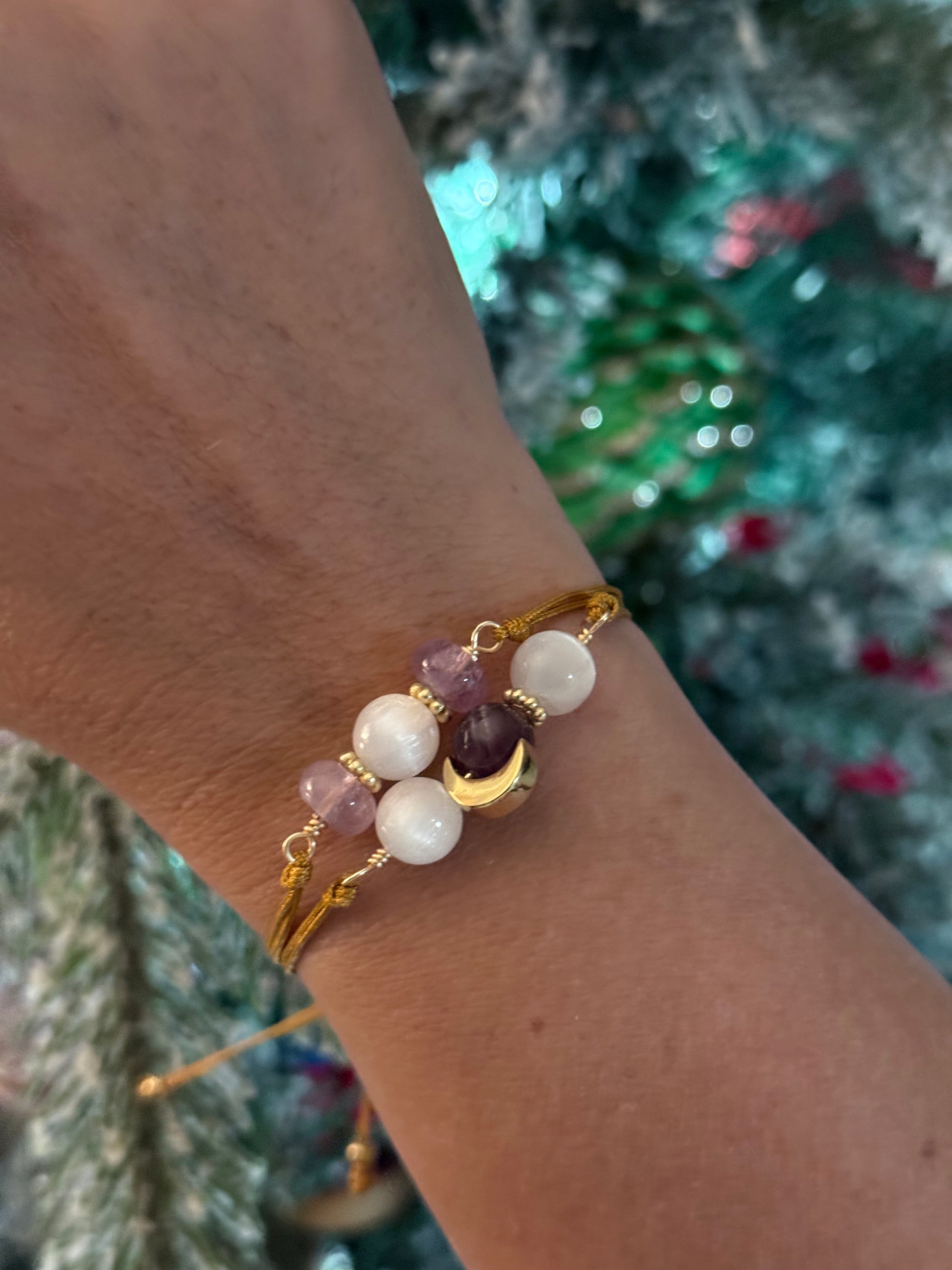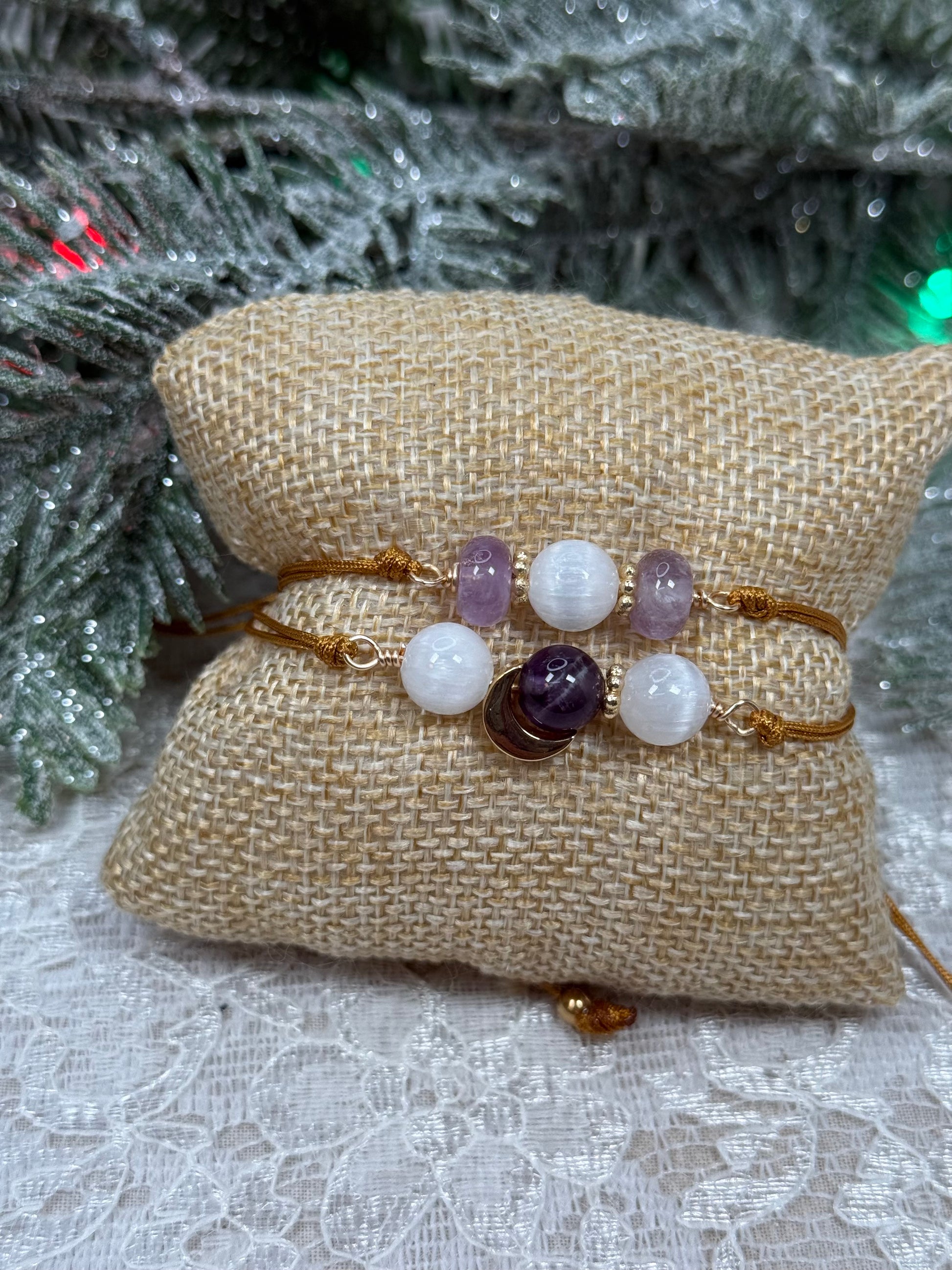 Pulsera ajustable con esferas de selenita y amatista. La selenita aporta claridad, y la amatista suaviza y calma. Un dúo perfecto para equilibrio y bienestar.