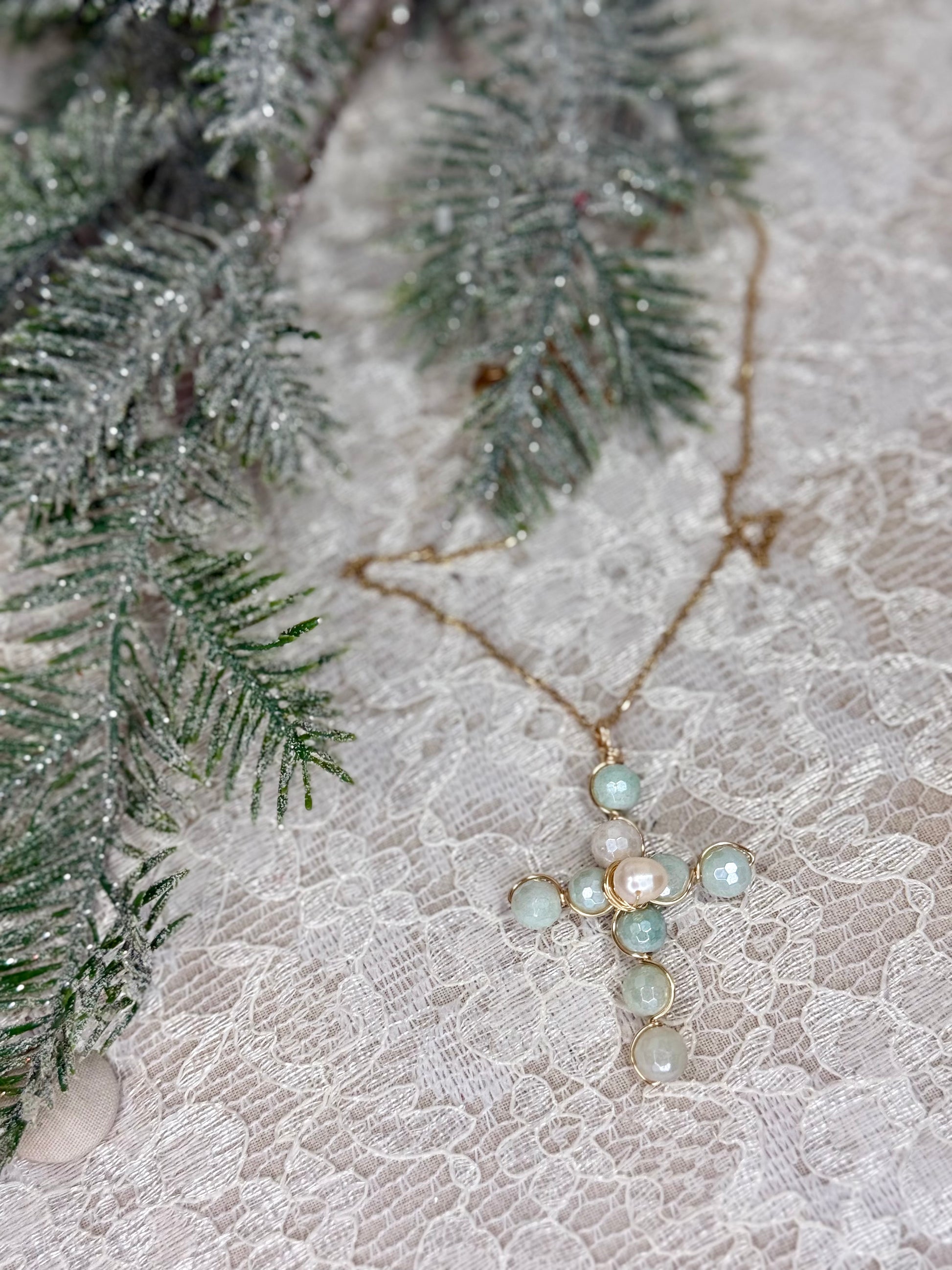 Cruz trabajada mano, ninguna es igual + alambre enchapado + Amazonita + perla + 18” stainless steel
