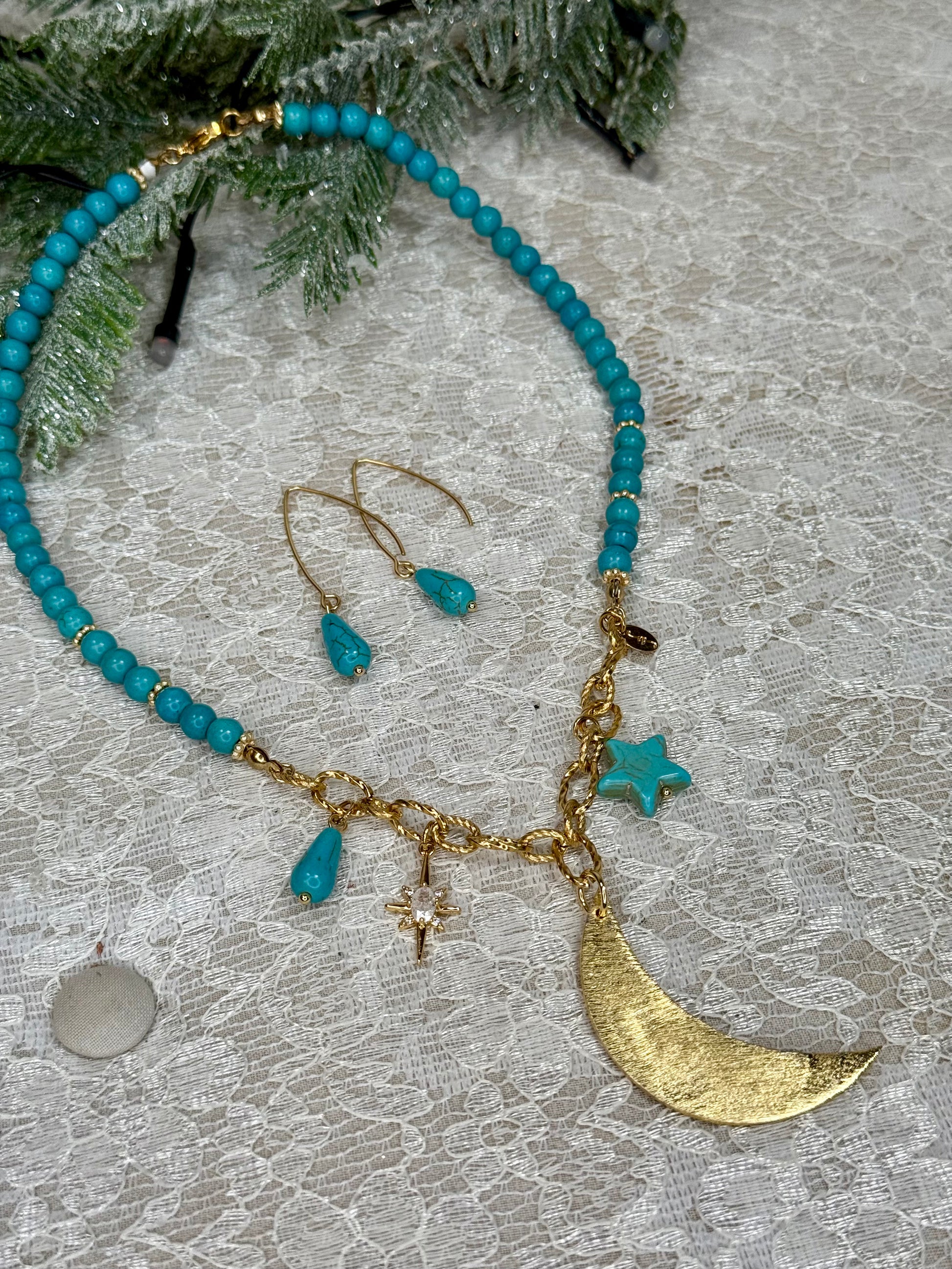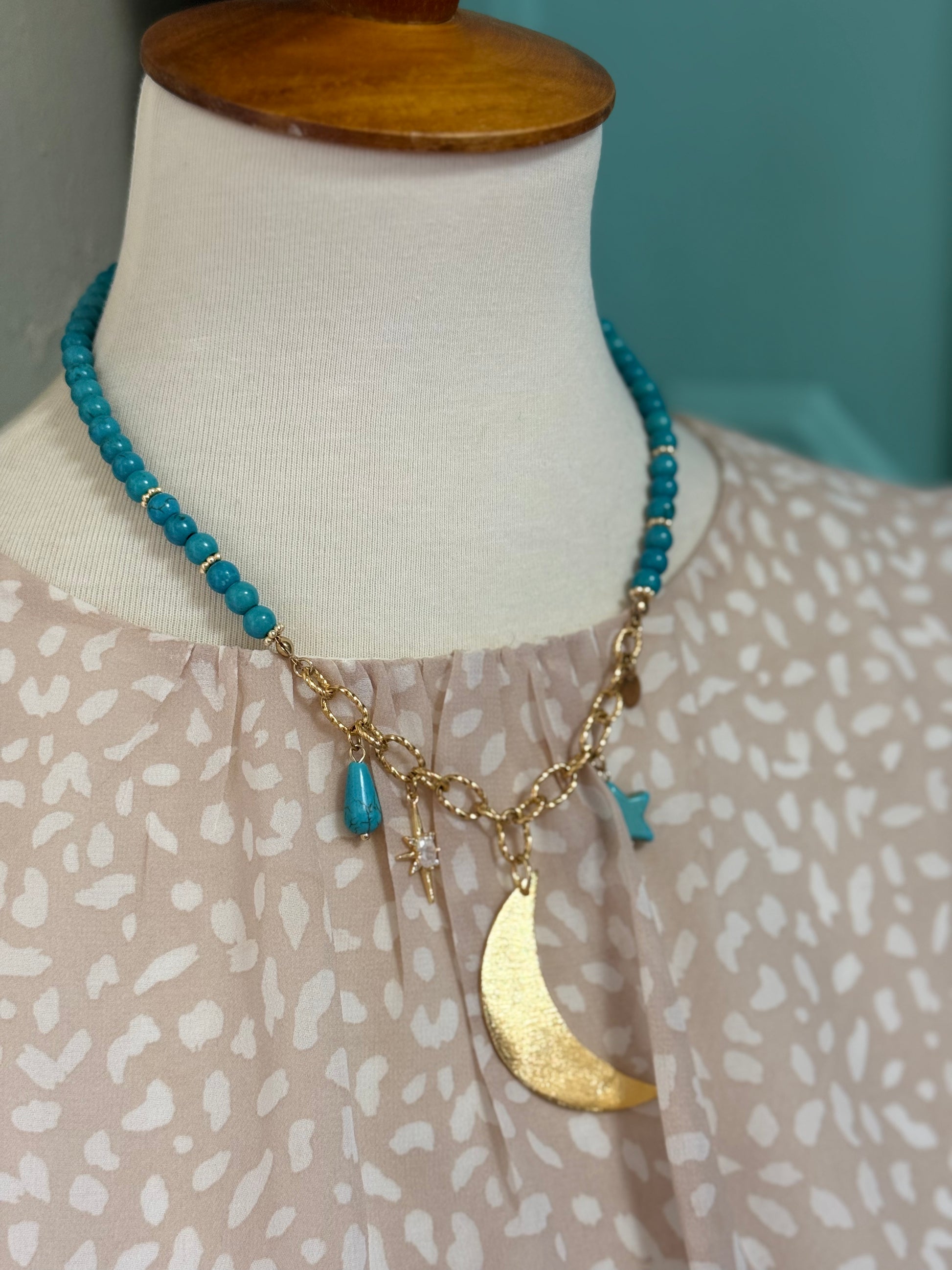 Collar con howlita  turquesa y charms dorados que celebran intuición, guía y belleza interior.