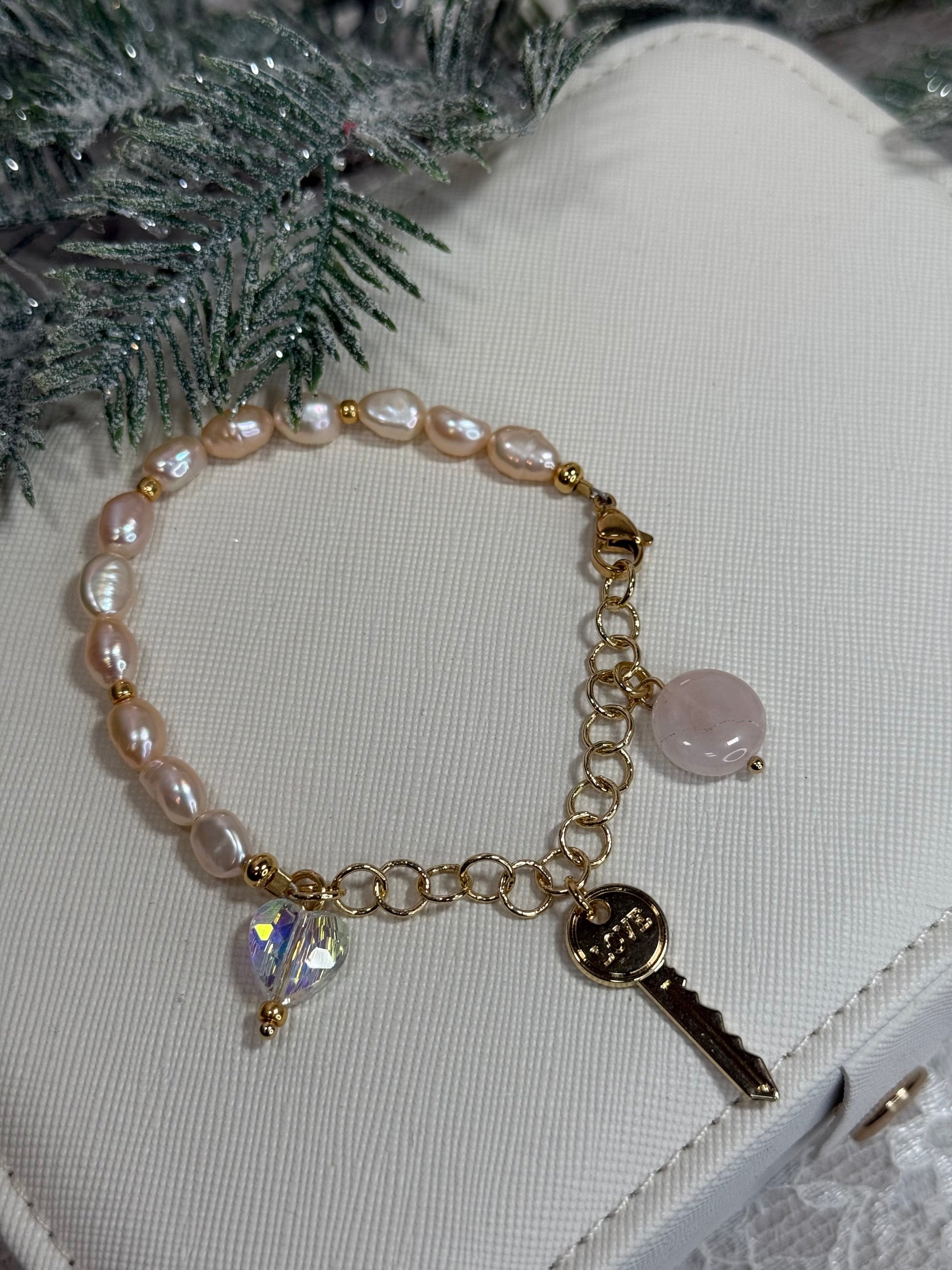 Perlas de agua dulce rosadas + cristal boreal + cuarzo rosado + llave 18k gold filled + gold filled + 7 1/2” +  dormilonas